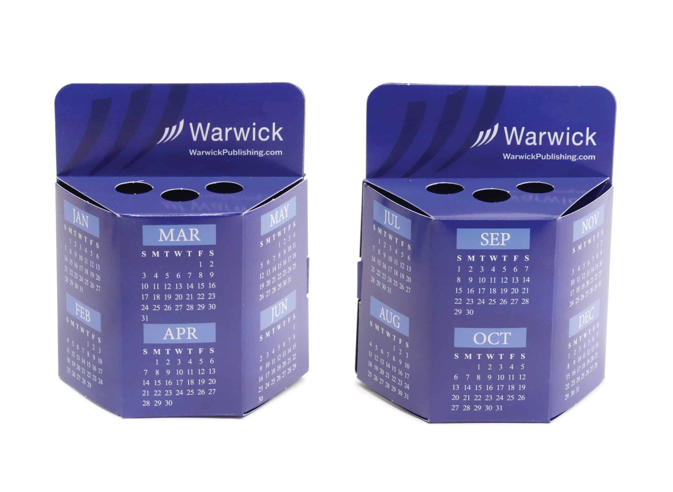 NEW Pen/Pencil Caddy that features your ad in full color w/full coverage all around, top to bottom. Sturdy 14pt coated 2 side stock easily pops open and locks in place. Vibrant eye-catching full color advertising will stand out on any desk or counter. Use our standard calendar art to make this a 12 month calendar! Lightweight and easily mailed with FREE mailing envelopes included. Get prime ad space on your clients desk! 4″ W x 4 7/8″ H x 3 1/4″ D